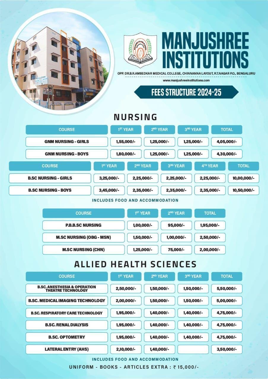 Manjushree Institutions, one of the prominent and successful Institutions in South India is located in the heart of Garden City - Bengaluru. Dr. R. T. Naik, who is an eminent surgeon imbibed with deep professional values and ethics, with a vision to impart quality Nursing education for the diverse student community, laid the foundation for Manjushree Institutions in the year 2003.Dr. R. T. Naik and Mrs. Manjula T. Naik, together built a platform for carving younger generations who are competent, talented and confident professionals. The Institution which carries a rich health care heritage from its 2 Mulitspecialty Hospitals, emphasis on a pragmatic training along with a student-centered philosophy, focused and engaging conceptual curricula. Our diverse population of students from different part of the world are moulded academically and professionally to be competent and compassionate Nursing & Health Care professionals.