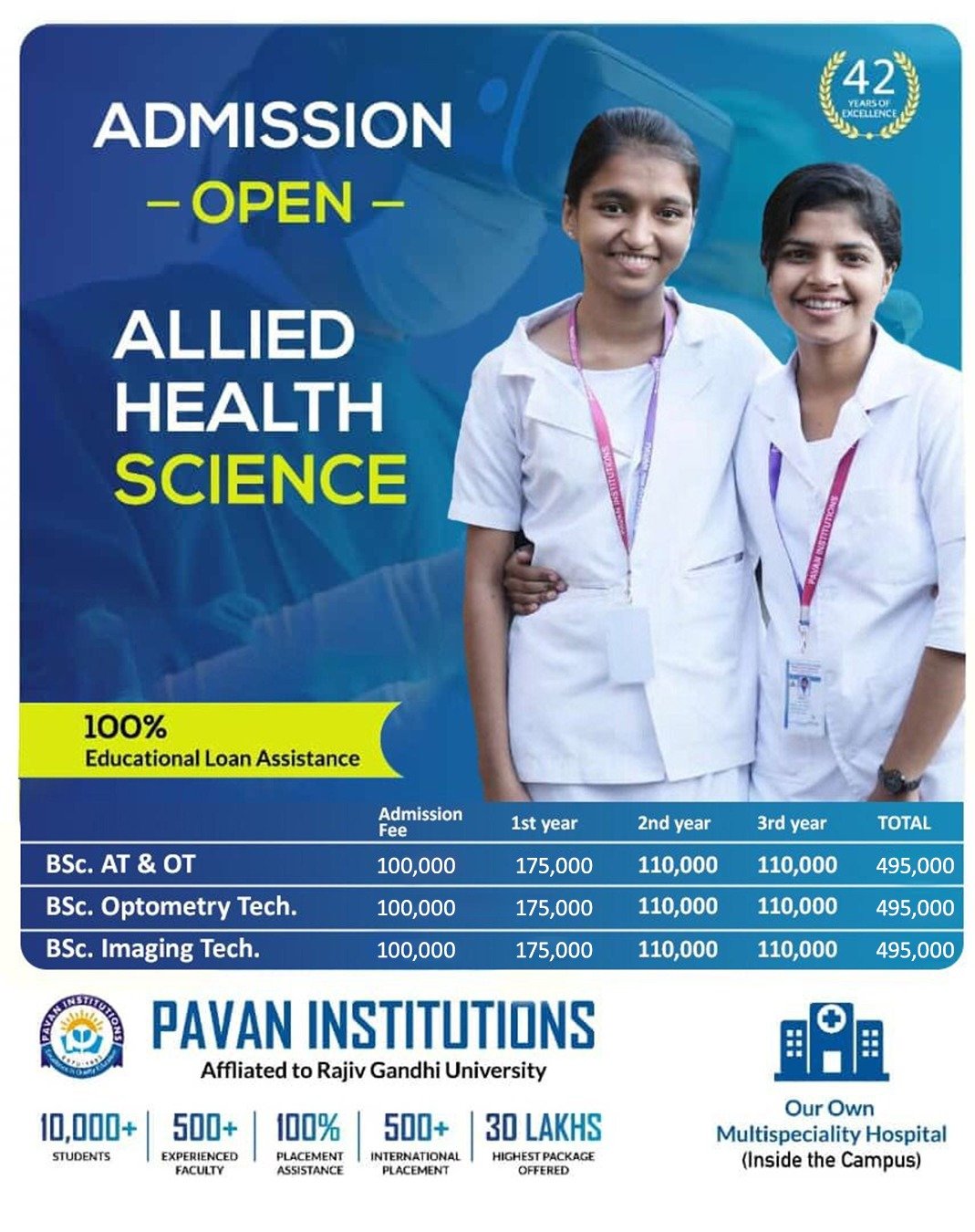PAVAN Institutions, established in 1982 in Kolar, Karnataka, is a renowned educational group offering diverse programs in Nursing, Pharmacy, Allied Health Sciences, Engineering, Polytechnic, and Management. With over 39 years of academic excellence, the institution is affiliated with RGUHS, VTU, and other educational boards, aiming to provide transformative learning experiences and foster a community of skilled professionals.